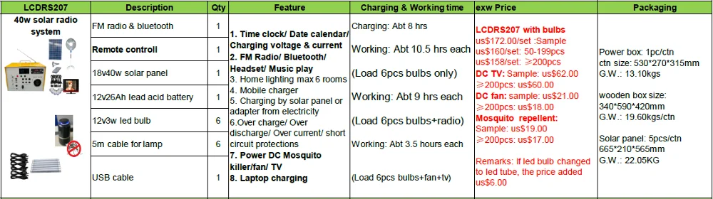 | Lighting time | Working: Abt 10.5 hrs each (Load 6pcs bulbs only) Working: Abt 9 hrs each (Load 6pcs bulbs+radio) Working: Abt 3.5 hours each (Load 6pcs bulbs+fan+tv) |