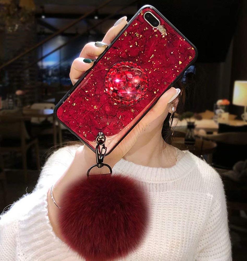 Sparkle Case Cover for iPhone 7 Plus , Marble Cover with Rabbit Fur Hairball Phone Case for iPhone Xs Max Xr