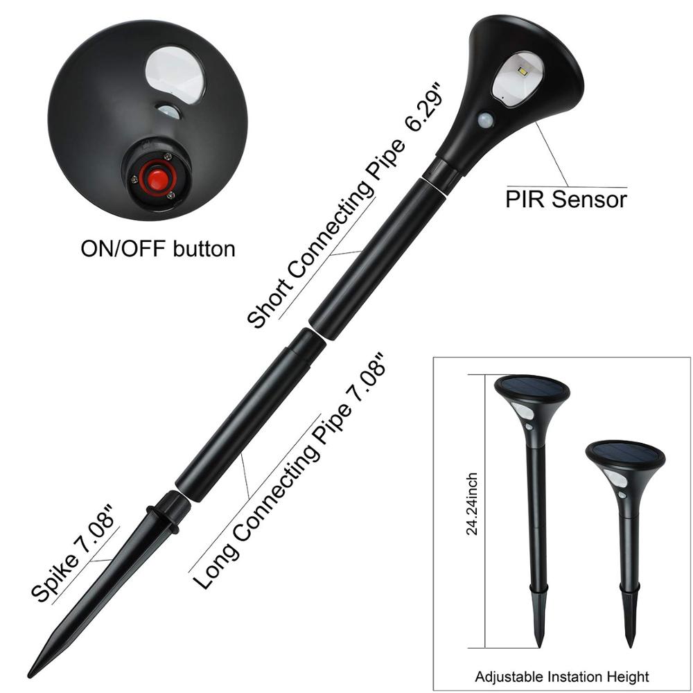 Photosensitive control+PIR sensing modes, automatic smart control, charge during the day, and discharge in the evening. When motion is detected in the evening, automatically enter into bright light mode, when people leave, after 22 seconds, it will automatically convert to weak light mode.