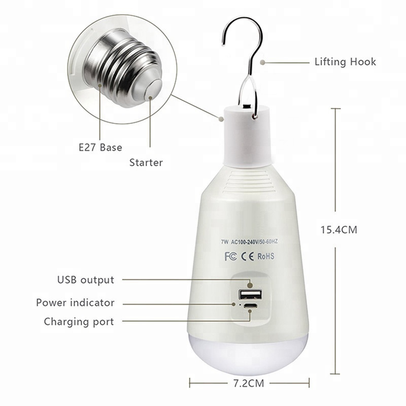 Unique Patent AC100-240V or USB 5V 7W Rechargeable Led Emergency Bulb, Phone Charging Led Camping Lantern with Detachable Hook