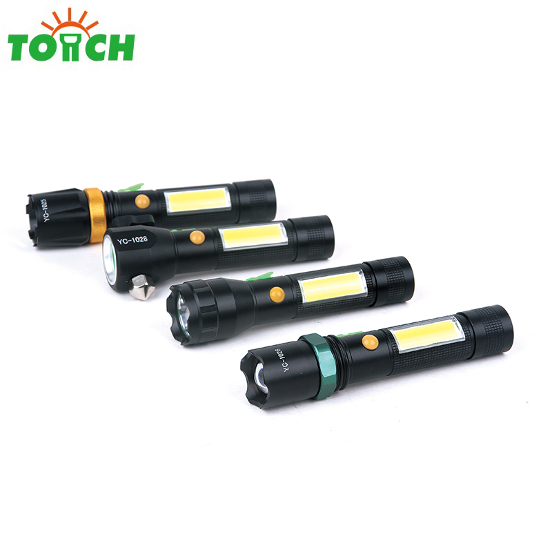 New USB rechargeable COB led flashlight tactical self defense led torch light with safety hammer