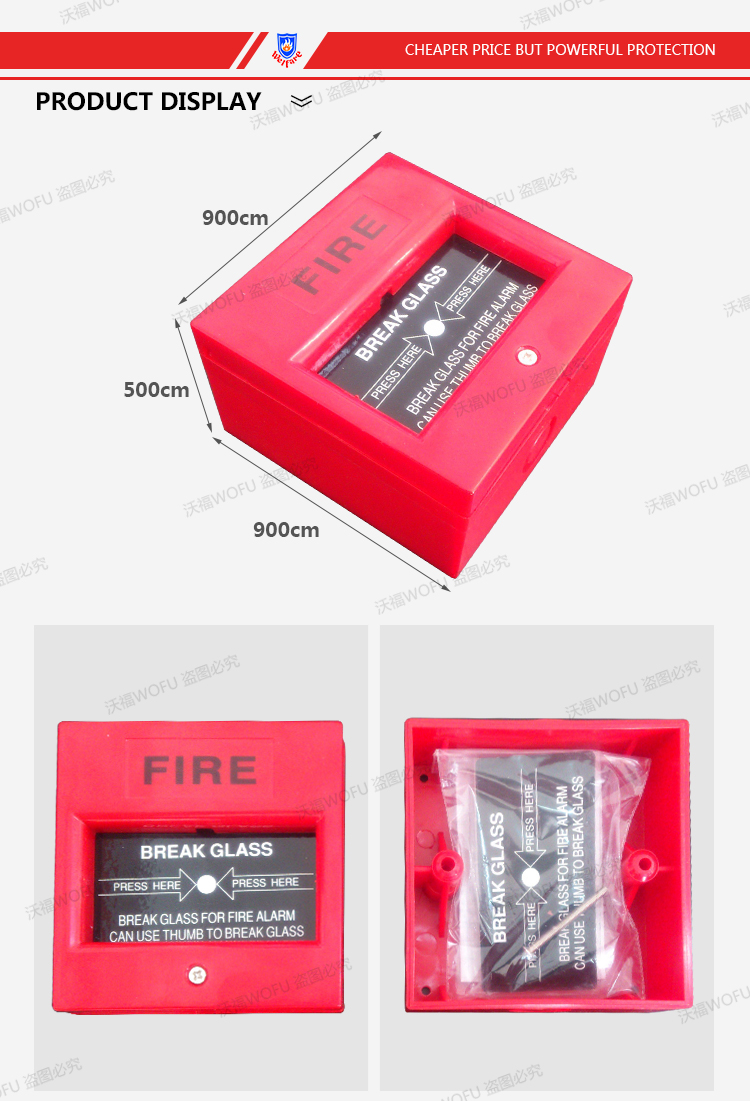 It can be send conflagration signal to controller who can use conflagration equipment of message in directly.The break glass,fire alarm button,is one of button which be installed public place peole exit and entrance.If you press down this button or break the glass,one signal will be input to fire control panel.It is one of button more emergency than smoke of heat detector,without confirmation will be alarm and connection the fire center.