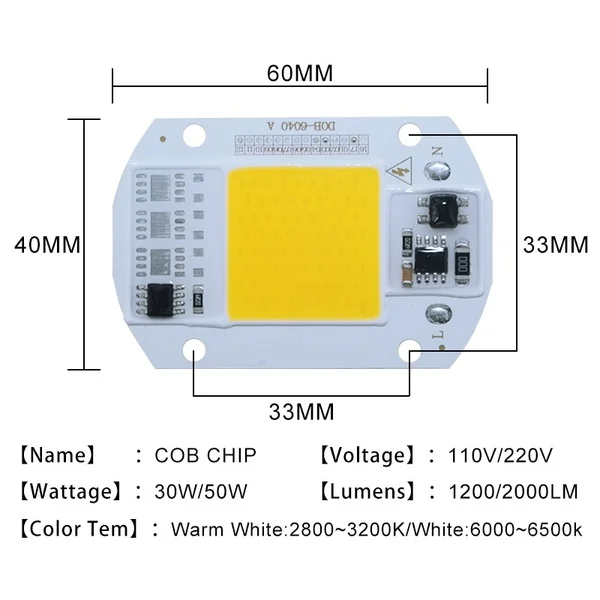 | Specifications: 1.Model Type: High Power Integrated Chip 2. Product name: Integrated LED Bead 3. Shapes: Tetragonum 4. Integrated way: 5. Power: 30W/50W 6. Forward Voltage: 10W:9.0-12V / Others: 30-36V 8. Luminous Flux: 90-110LM/W 9. color-rendering index: 60-85 10. Beam Angle: 120 degrees 11. Working Temperature: -20 centigrade to 60 centigrade 12. Color Temperature: Warm White: 3000-3200K Cold White: 6000-6500K 13. Lamp Body Material : Aluminum 14. Life Span: more than 100,000 Hours |