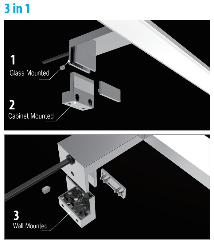 - Glass Mount/Cabinet Mount/Wall Mount