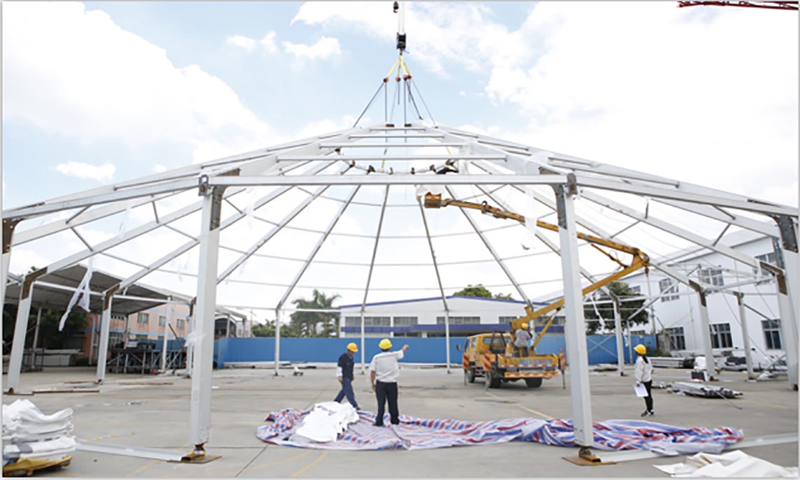 The hexadecimal double-decker tent is designed and innovated based on the structure of the former multi-side pagoda and the principle of the double deck structure. It must be very eye-catching with big width clear span decorated with the unique out looking.