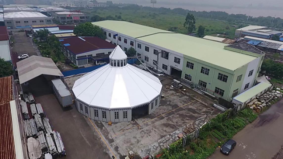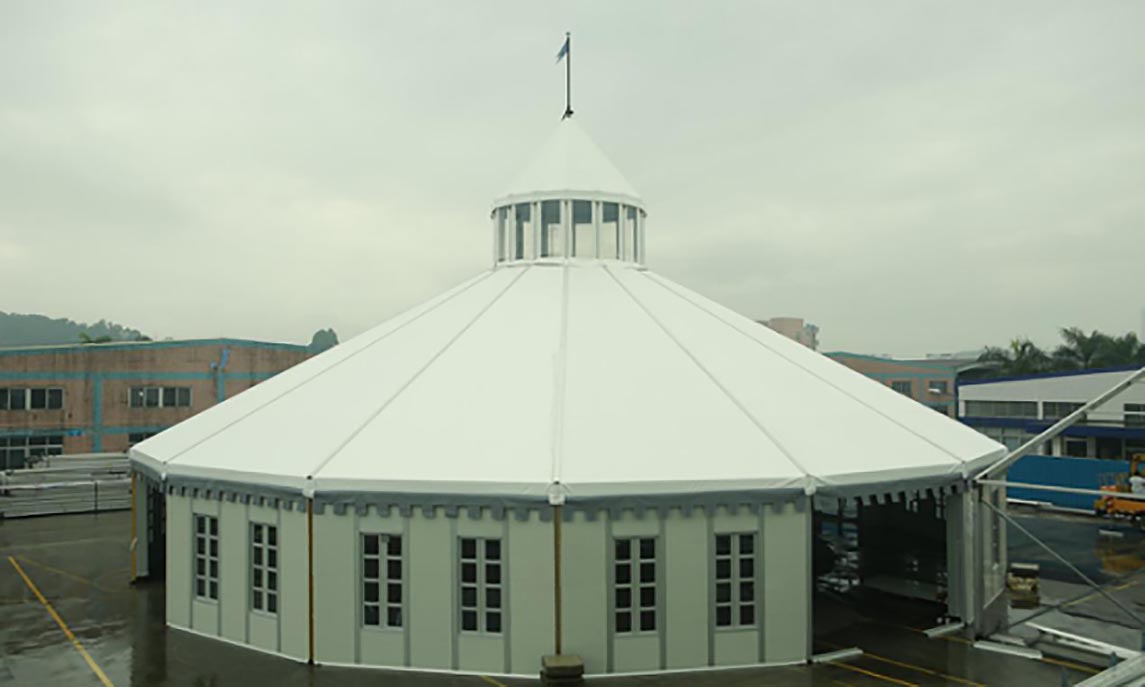 This tent is 26m in diameter and up to 19m in total height; With isolated panel and glass walls and doors.