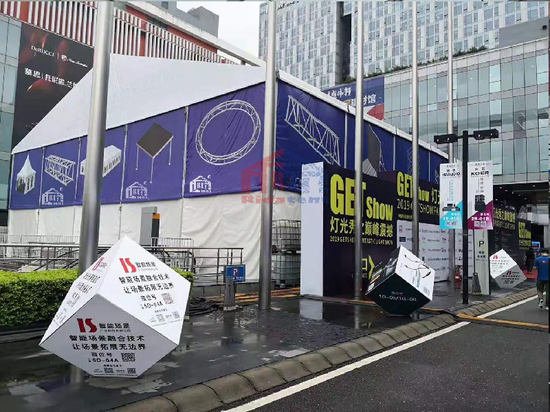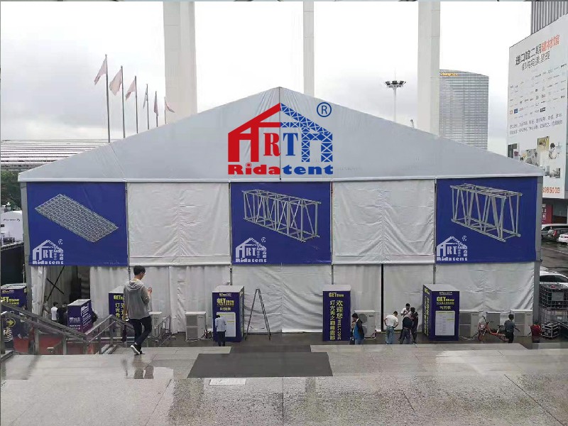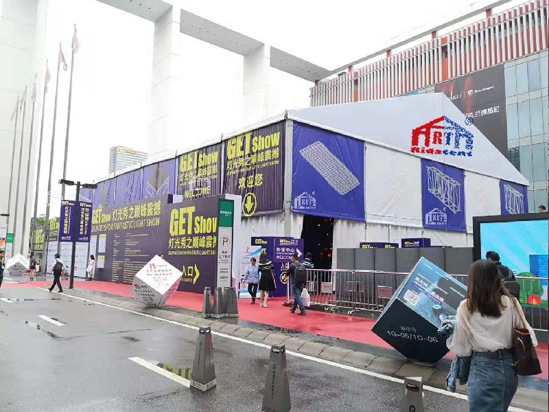 In 2016, Rida Tent provided the 25 × 30 × 8m PVC tent for lighting exhibition used in Guangzhou International Lighting Show. This lighting exhibition is the largest show in China and there were a lot of tent manufacturer took part in this events. Rida Team built up this big size tent with necessary decoration to enrich the lighting show. The 8m height size was very special in this events and enables better effect for the lighting performance. And it turned out that our tent is favored by all walks of life after this show.