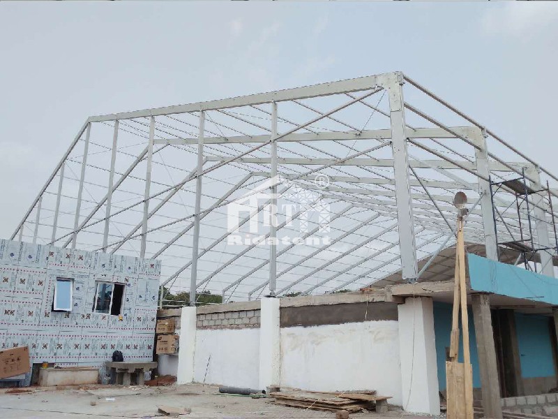 Our Ghana client required for sending technical expert and a tent-building team to provide support and assistance. So Rida Tent sent a expert and a team of professional builders who have more than 15-year experience of tent constructing to Ghana as our client wish. It took just 3 days to finish the building task. The clear span design enables the user arrange the inner space flexibly. Besides, speech stage, chairs and other facilities are available to be putting inside the church tent.