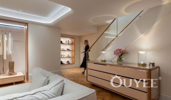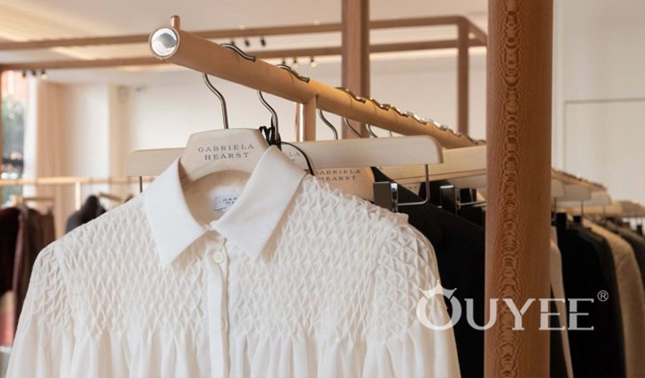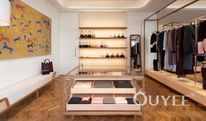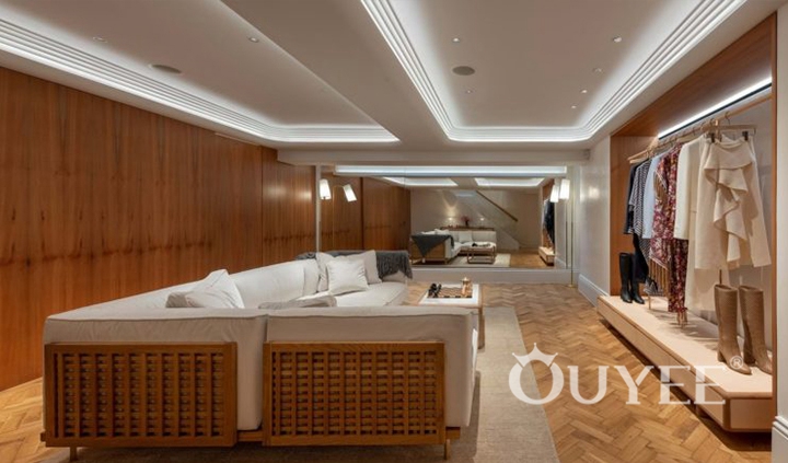 The ceiling comprises of a seemingly carved-out mosaic of planes, embedding rows spotlights in its ridges.Sleek metal clothing racks dangle from the ceiling in the middle of the UNIVERS store, and are paired with additional clothing racks and shelving lining the wall. The back wall is clad in mirrors which optically enlarge the store, and features built-in shelving. Additionally, chunky marble displays dot the premises, and the cozy seating area which enables shoppers to sit back and ponder over the next trophy purchase.Nonetheless, the different levels vary in style: Fashion for modern women can be found on the ground floor. Bright wood combined with white metal – a minimalistic design with Scandinavian impression – displays the appropriate background to address a younger target group.