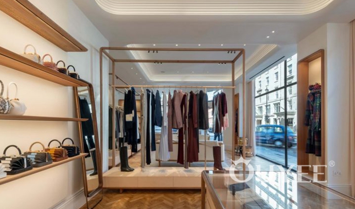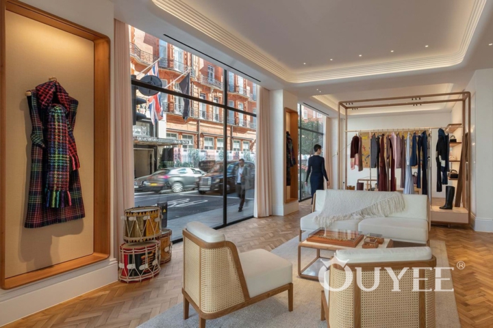 To preserve the transparency and unencumbered views of the interior, the store windows do not display mannequins or products but frame the interiors as two distinct settings – a clothing section that contains bespoke racks and a relaxed lounge seating and another space featuring accessories and knitwear. The interior spaces are designed to flow seamlessly, creating a relaxed experience where the clothing and accessories are the primary protagonists.