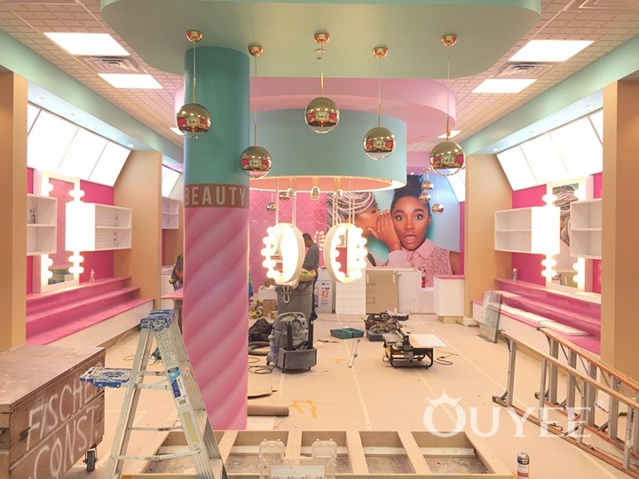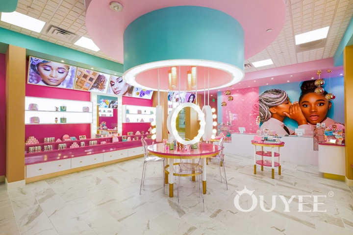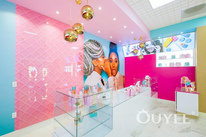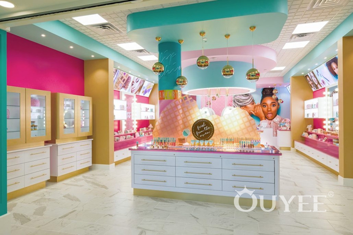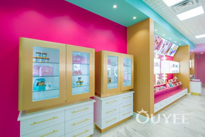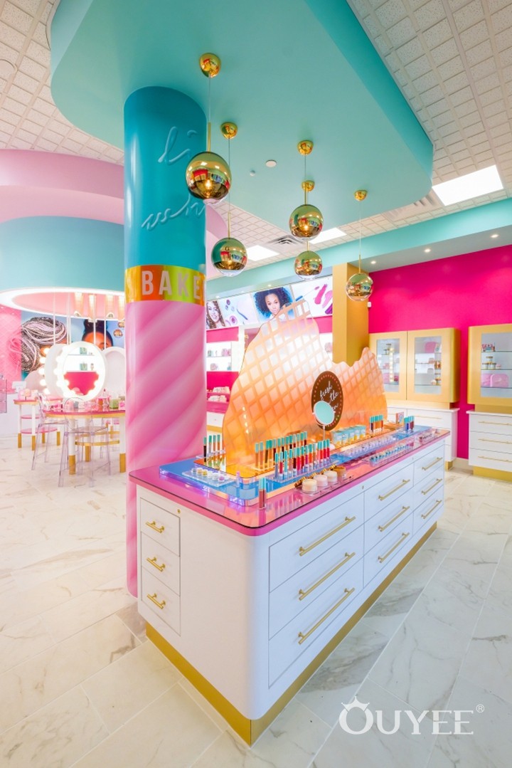 With the intriguing concept of “beauty meets gourmet dessert” in mind, we created a space where products are displayed as in a dessert store, with the same final effect of leaving the customers wishing for more. We used a young and vibrant palette of pink, tan and turquoise, then allowed this mix to stretch from pastel to bright tones, creating a place that looks cheerful and playful, yet not overwhelming.