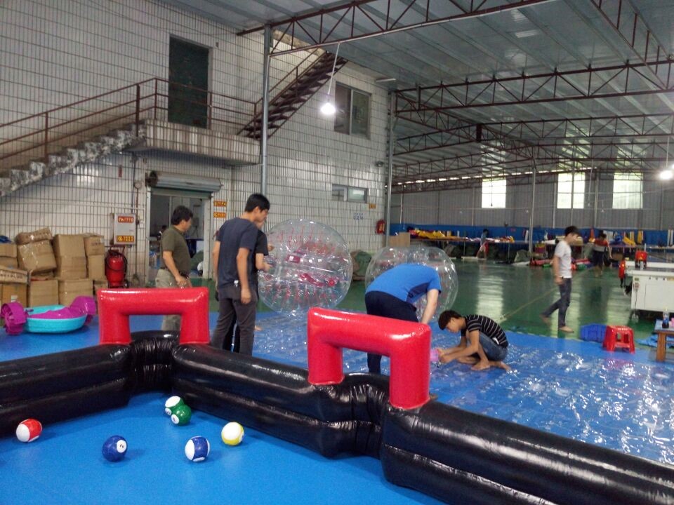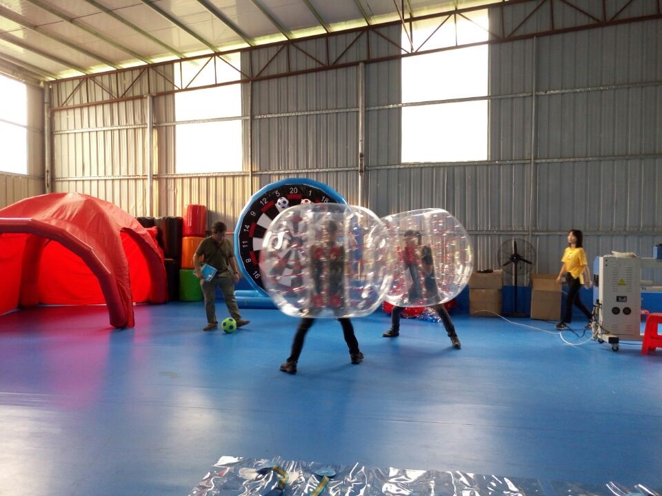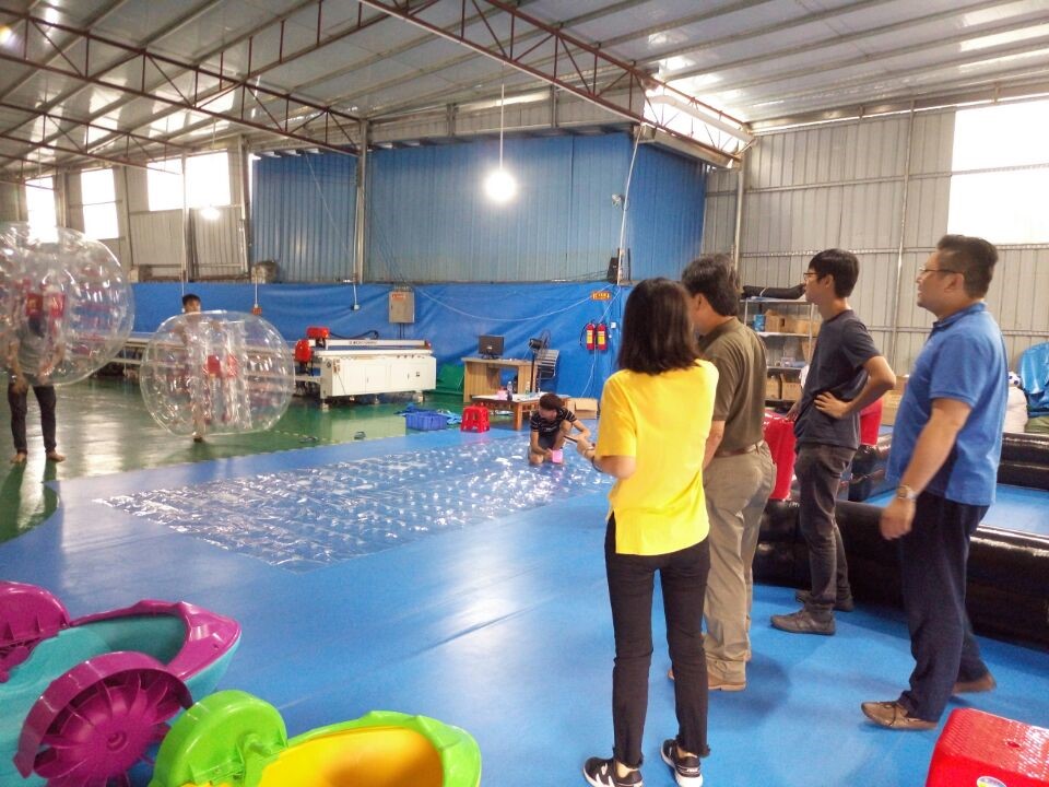 We were manufacturing the inflatable products at that time, so firstly we showed our clients around the inflatable testing area and making a brief introduction. Then we were headed to the air-sealed area, where has some air-sealed products for testing, like the inflatable bubble ball, inflatable tent, inflatable soccer dart board. Fortunately, our clients are interested in these products very much, especially the bubble ball, and all them would like to have a try. Then we introduced more details of these products, teaching them how to play.