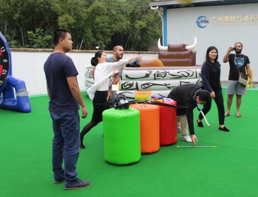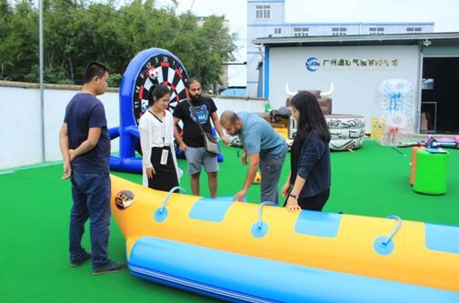 After leaning about our flying fish and banana boat technology details, our clients took a look with our other sports games, such as bubble soccer balls, inflatable mechanical bull games, foot darts etc.