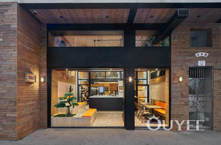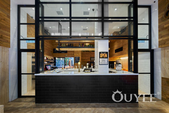 The front of the coffee shop is open to the street and defined by a dual black door frame surrounded by wood.