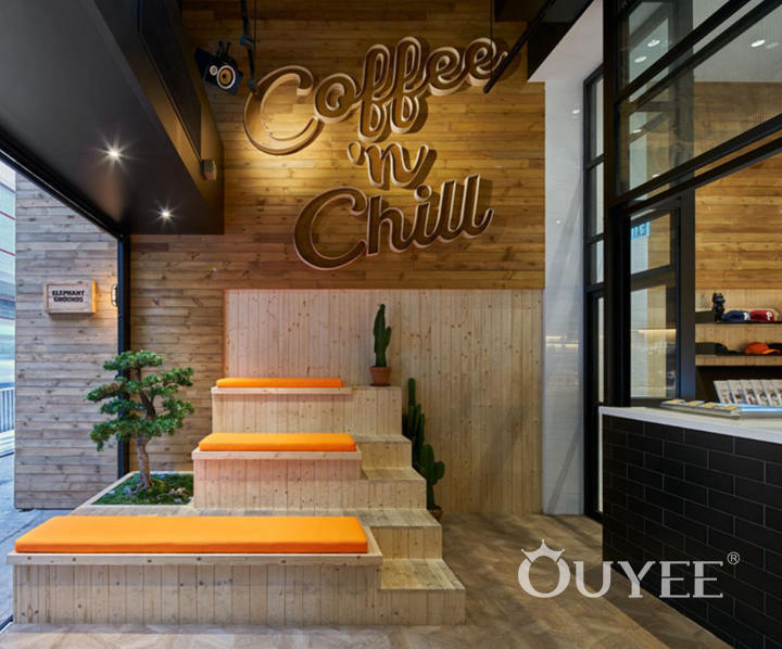 Custom designed wood tiered seating with orange cushions sits below a lighted three dimensional wood sign that reads, “Coffee ‘n Chill.” A green bonsai and a few cacti add a touch of nature color to the seating arrangement in this indoor-outdoor anteroom.