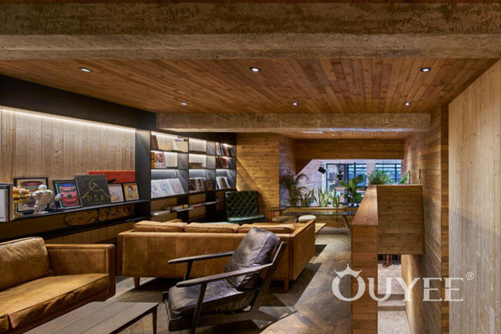 Upstairs there’s more seating in the Living Lounge, with multiple coffee tables, couches, and a book case with hidden lighting, that help to create the feeling of drinking a cup of coffee at home. Green indoor plants and a green, leather upholstered chair bring a pop of color to the room.