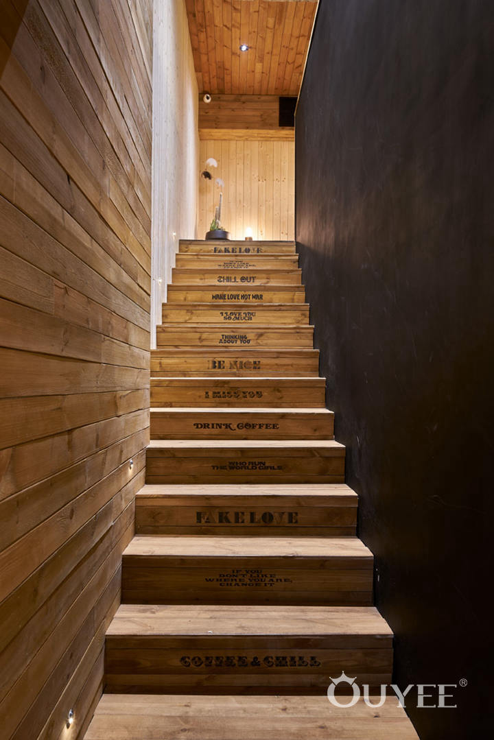 In between black and wood walls, a set of wood stairs stamped with sayings like “Be Nice” and “Chill Out”, lead to the upper level of this coffee shop.