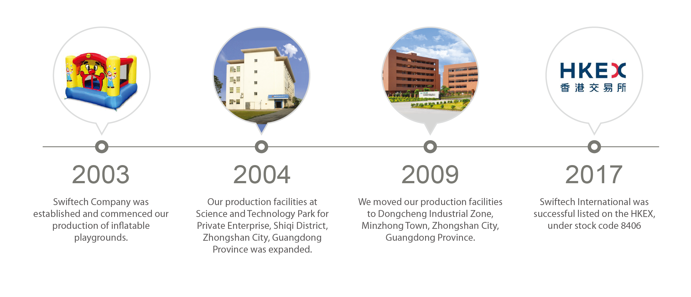 Swiftech Company was established in June 2003 with the aim to launch and develop new and marketable inflatable playgrounds and inflatable products. Our Group launched its first inflatable playgrounds production in 2003.