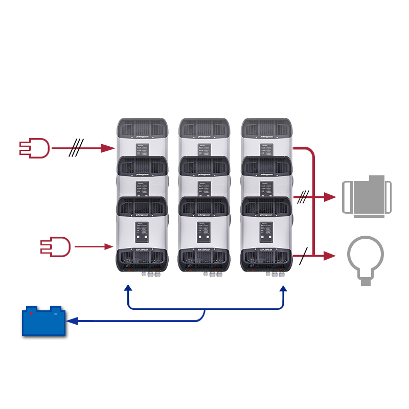 Power available to the users can be adapted in the course of time by adding XTM Series Xtender Inverter in parallel or by creating additional phases. Therefore, it is therefore possible to install up to 9 XTM inverters in a 3-phase power system.