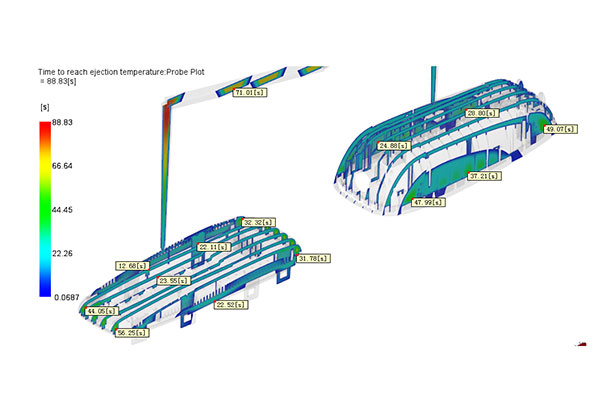 The time to reach ejection temperature is about 55 s for 95 % melt volume freezed, the cold runner is about 35 s for 60 % melt volume freezed