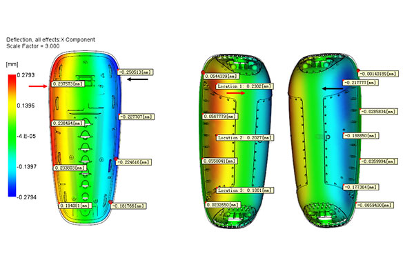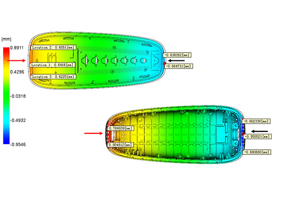 ■ This part have large uneven shrinkage at the X, Y, Z deflection, the different volumetric shrinkage (different wall thickness) result in the defect.