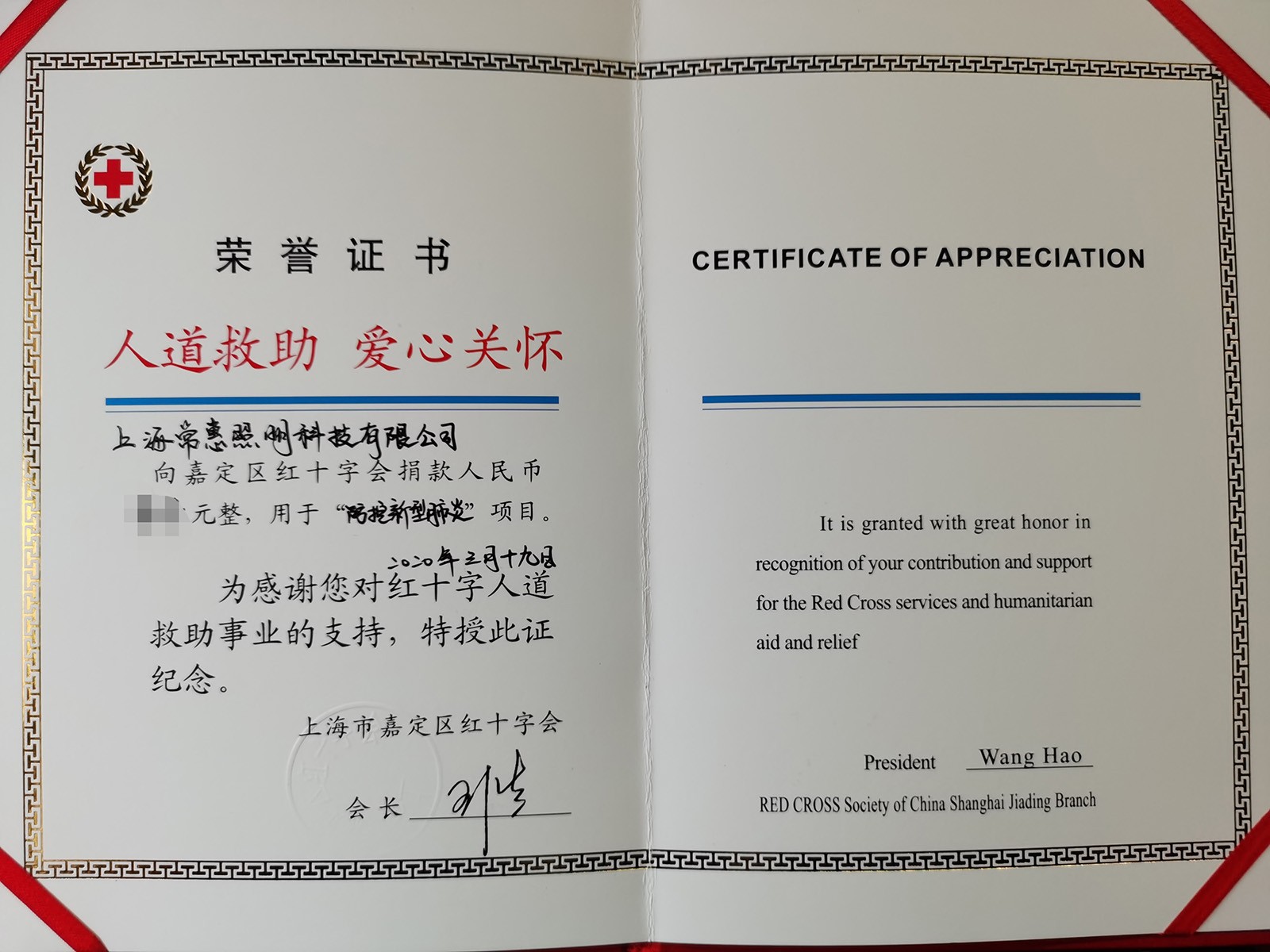 On March 27, 2020, President Yin of the Jiading District Private Enterprise Association, on behalf of the Shanghai Red Cross Society of Jiading District, sent us a certificate of donation in recognition of our company's donation during the epidemic.