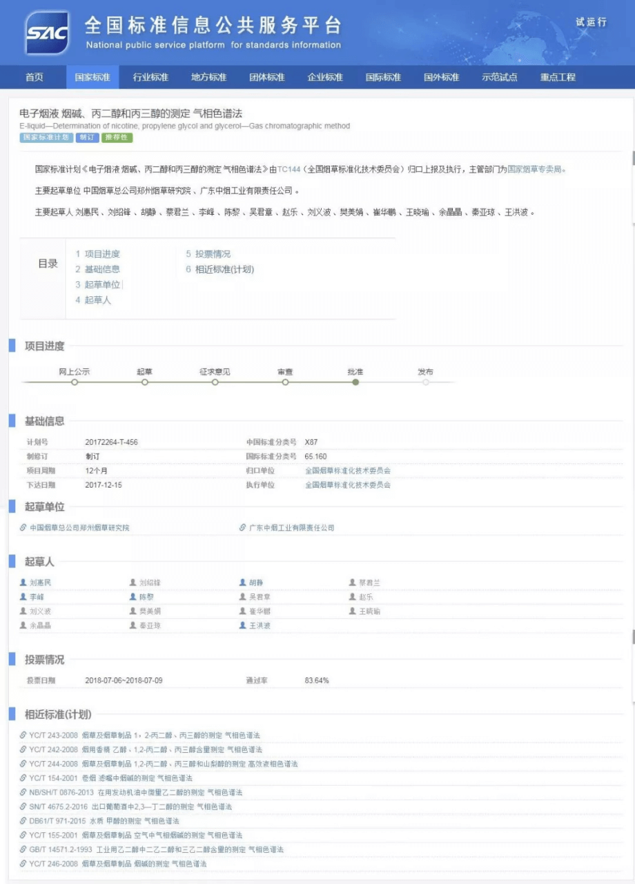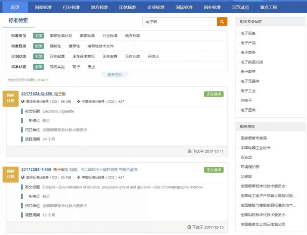 The national standard of electronic cigarettes has always been a hot topic in the industry before. By searching the keyword "electronic cigarettes" on the national standard information public service platform, we can see that there are currently two results, one is electronic cigarettes and the other is electronic cigarette liquid. The status is "approved". That is to say, without any accident, the standard will enter the "release" link in the near future and end. China has no history of national standards for electronic cigarettes.