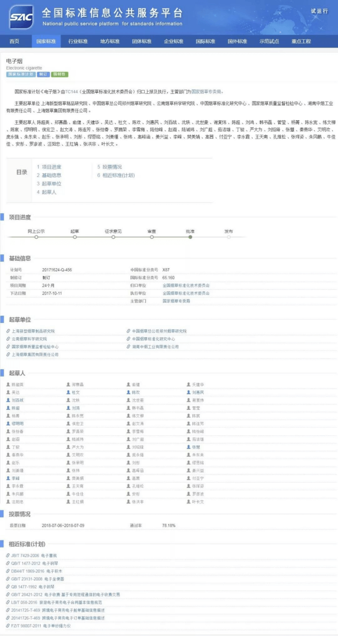 According to the standard cycle and date of delivery, the cycle of e-cigarette standard is 24 months, and it will be issued by October 2019 at the latest. However, the standard has entered the approval stage, with the voting pass rate reaching 78.18%, which also means that it is expected to be introduced in the year.