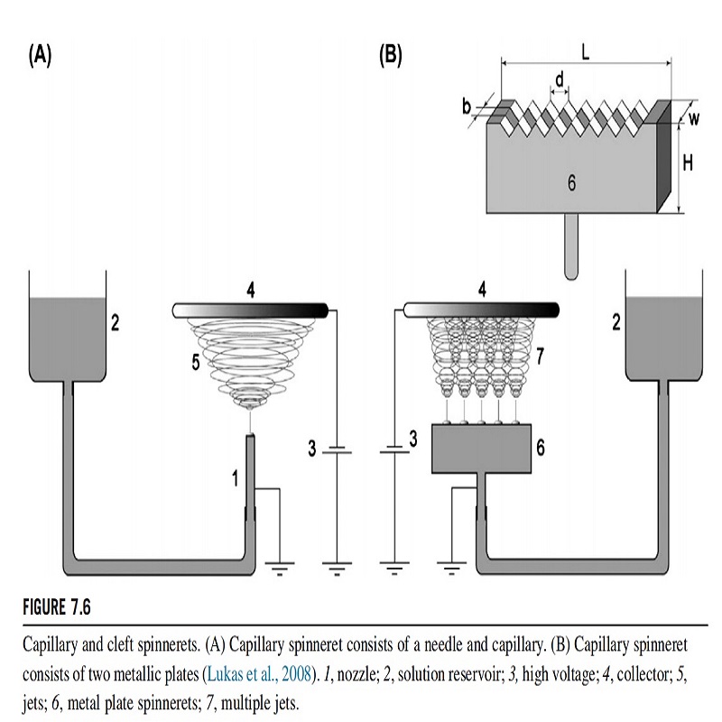 Lukas et al. reported an electrospinning setup that used linear clefts as the spinneret (Fig. 7.6). The authors also developed a one-dimensional electrohydrodynamic theory to explain the process of electrospinning conductive liquids from an open plane surface (Fig. 7.6). During the electrospinning process, the amplitude of characteristic wavelength grew faster because of the electrical force. The fastest-growing stationary wave marked the onset of electrospinning from a free liquid surface. This theory not only predicated the critical value of the electrospinning process but also explained the upward needle-less electrospinning.
