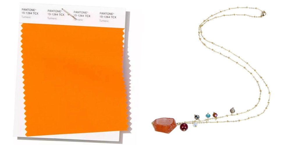 3. Turmeric is a lively orange, so add a touch of spice to your palette. The metal chain is lined with stone and agate beads to highlight the spice and vitality of the turmeric pendant.