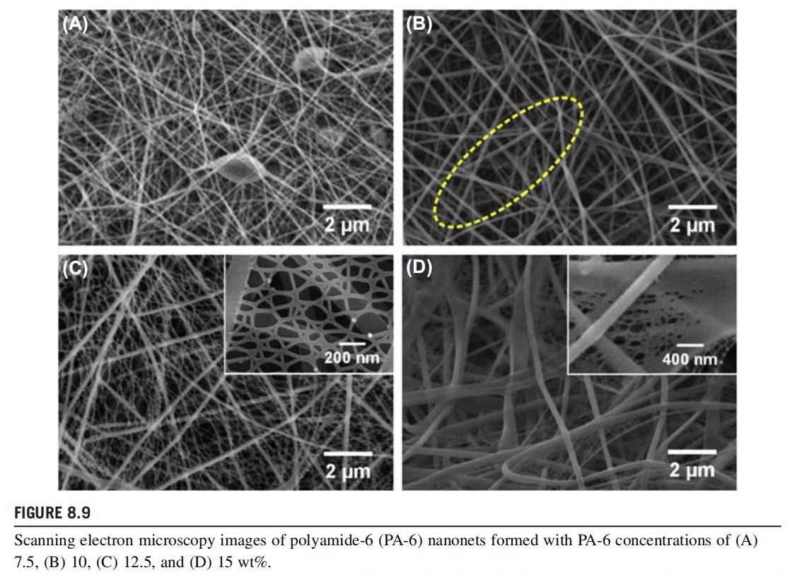 The polymer concentration in the solution has great effects on the structure of electrospun nanofibers owing to the resulting significant variation in the viscosity, which have been widely studied by researchers. Bead-on-string fibers are usually formed from solutions with low polymer concentration, which could be ascribed to the low viscosity. With increasing solution concentration, the spherical beads change to spindlelike beads and then form uniform nanofibers, and the fiber diameter increases accordingly. Similarly, changes in solution concentration result in different structures of nanonets during the electronetting process. Ding et al. first fabricated PAA nanonet membranes from solutions with various concentrations and then investigated the structures of the nanonets systematically. The nanonet membranes obtained from 6 wt% PAA solution had the largest pore size and nanowire diameter deviation, while the pore size of the nanonets formed from 8 wt% solution decreased, and their shapes became uniform. Moreover, with further increasing PAA concentration, the resultant membranes showed the smallest average pore size compared with the two other membranes. Then, Zhang et al. found that PA-6 nanofibers obtained from 5 and 7.5 wt% solutions showed microsized beads along the fiber axis, due to the low solution viscosity. As shown in Fig. 8.9AeD, when the PA-6 concentration was higher than 10 wt%, the beads disappeared and a handful of nanonets appeared in the membranes, as indicated in the dashed circle. In particular, the coverage rate of nanonets in PA-6 membranes obtained from a 12.5 wt% solution increased sharply, which could be ascribed to the increased conductivity and reduced surface tension of the solution (Fig. 8.9).