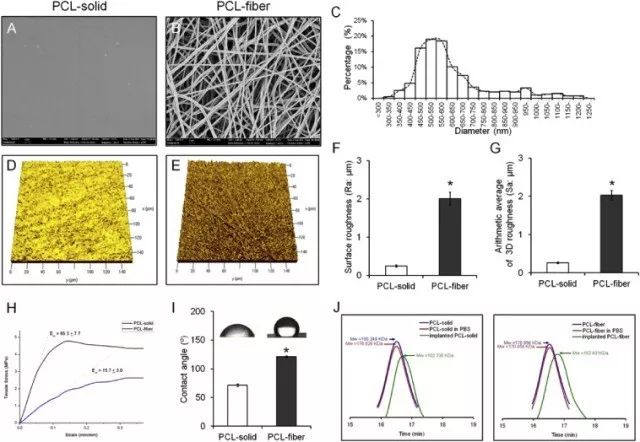 Fig. 1. Characteristics of the PCL-solid and PCL-fiber. The SEM images of PCL-solid (A) and PCL-fiber (B) were observed. Scale bars represent 2 μm. The fiber diameters of PCL-fiber were measured from SEM images and the distribution is presented (C). The 2D and 3D roughness of the PCL-solid and PCL-fiber (D, E, F, and G) were measured, respectively. Tensile strength and elastic modulus (H), water contact angle (I), and biodegradation (J) were also detected. Data are shown as the mean ± SD (n = 10).* Significant differences between PCL-solid and PCL-fiber (p < 0.05).