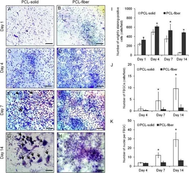 Fig. 3. Wright's staining images of the cells adhered onto the PCL-solid (A, C, E, and G) and PCL-fiber (B, D, F, and H). The arrow presents FBGCs (number of nuclei ≥ 3). Scale bars represent 100 μm. The numbers of the mono-nucleated monocyte/macrophages (I), FBGCs (J), and nuclei per FBGC (K) were counted. Data are shown as the mean ± SD (n specimen = 4, 12 random areas per specimen). * Significant differences between PCL-solid and PCL-fiber (p < 0.05).