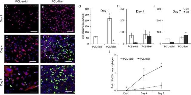 Fig. 4. Immunofluorescence analyses on the macrophage polarization-related markers in the cells adhered onto the PCL-solid and PCL-fiber at days 1, 4, and 7 post-implantation. Fluorescence images of adhered cells, which were immunostained for CCR7 (red, M1 phenotype marker) or CD163 (green, M2 phenotype marker), were observed on PCL-solid (A, C, and E) and PCL-fiber (B, D, and F). The number of CCR7-or CD163-positive cells (M1 or M2) (G-I) and the ratio of CD163/CCR7-positive cells (M2/M1) (J) were counted. Data are shown as the mean ± SD (n specimen = 4, 6 random areas per specimen). * Significant differences between PCL-solid and PCL-fiber (p < 0.05). (For interpretation of the references to colour in this figure legend, the reader is referred to the web version of this article.)