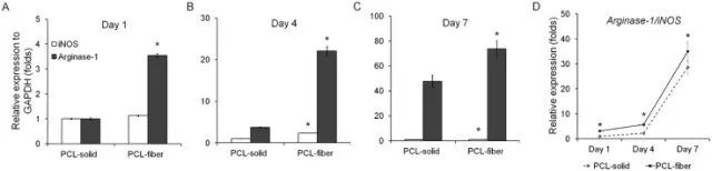 Fig. 5. qPCR analyses on the expression of macrophage polarization-related genes on PCL-solid and PCL-fiber at days 1, 4, and 7 post-implantation. Expression of M1 phenotype marker (iNOS) and M2 phenotype marker (arginase-1) were detected (A-C). Expression ratio of arginase-1/iNOS-positive (M2/M1) was calculated (D). Data are shown as the mean ± SD (n specimen = 4). * Significant differences between PCL-solid and PCL-fiber (p < 0.05).
