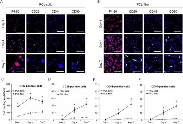 Fig. 6. Immunofluorescence analyses on the MSCs-related markers in the cells adhered onto the PCL-solid and PCL-fiber at days 1, 4, and 7 post-implantation. Fluorescence images of adhered cells, which were immunostained for F4-80 (red, macrophage marker), CD29, CD44, and CD90 (green, MSCs markers), were observed on PCL-solid (A) and PCL-fiber (B). Scale bars represent 100 μm. The numbers of F4-80-cells, CD29, CD44, and CD90-positive-cells were counted, respectively (C, D, E, and F). Data are shown as the mean ± SD (n specimen = 4, 6 random areas per specimen). * Significant differences between PCL-solid and PCL-fiber (p < 0.05). (For interpretation of the references to colour in this figure legend, the reader is referred to the web version of this article.)