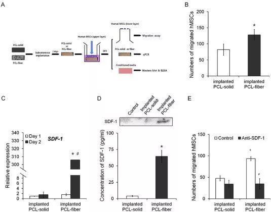 Fig. 7. Effects of the implanted PCL-fiber and PCL-solid on the human MSCs migration ex vivo. A schematic diagram of ex vivo experiments is present (A). The number of migrated hMSCs was counted in a trans-well culture (B). The expression of SDF-1 transcript was examined at days 1 and 2 post-implantation (C). To analyze the secretion of SDF-1 protein from the cells onto the PCL-fiber to the medium, Western blot and ELISA assays were performed (D). With or without neutralization of SDF-1, the numbers of migrated human MSCs were counted (E). * Significant differences between PCL-solid and PCL-fiber (p < 0.05). # Significant differences between day 1 and day 2 after implantation (p < 0.05).