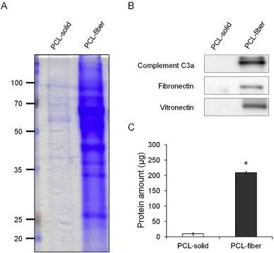 Fig. 8. Protein adsorption onto the PCL-solid and PCL-fiber implanted into the subcutaneous tissues for 12 h. A same portion of the adsorbed proteins onto the PCL-solid and PCL-fiber was analyzed by SDS-PAGE and stained with Coomassie blue (A). Western blot analyses on the complement C3a, fibronectin, and vitronectin adsorbed onto the PCL-solid and PCL-fiber were performed (B), and total amounts of the adsorbed proteins were determined (C). * Significant differences between PCL-solid and PCL-fiber (p < 0.05). (For interpretation of the references to colour in this figure legend, the reader is referred to the web version of this article.)