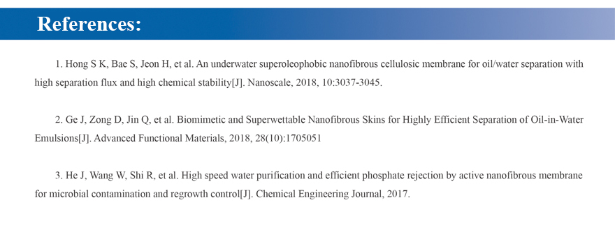 Due to its unique advantages, electrospinning fiber membrane plays an important part in separation application, showing the great property in filtration, especially in water filtration and air filtration. And therefore, it has a great development prospect in membrane separation field. Nowadays, the separation membranes are mostly composite membrane structures. Since the pore structure of electrospinning fibers is relatively scattered and dead holes do not occur, they can be used as the intermediate layer of the composite membrane, and the filtration efficiency of the composite membrane is greatly improved.