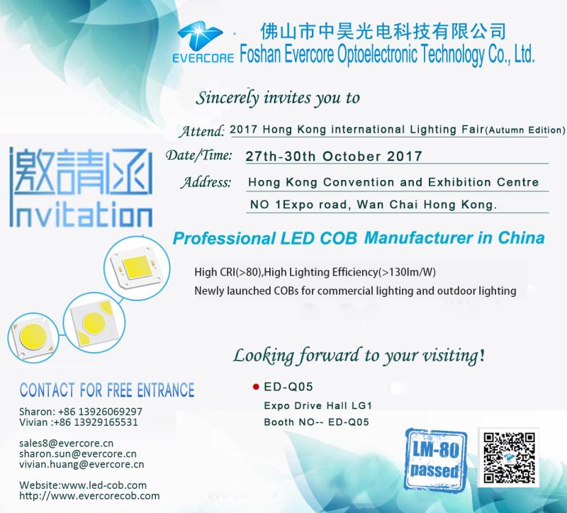Evercore will take this opportunity to display our newly launched COB modules ,with High CRI , Our COB are LM-80 Certified with high CRI(>80),high lighting efficiency(>130lm/W).