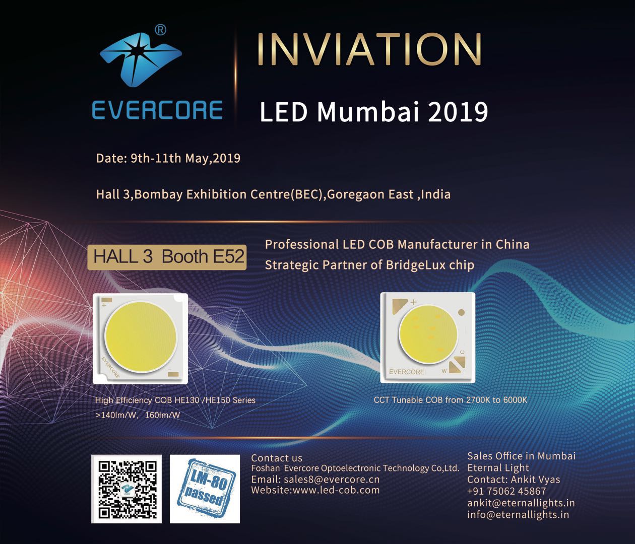 Evercore will take this opportunity to display our newly launched COB modules ,with full spectrum series-- High CRI over 97 ,high lighting efficiency(>160lm/W),CCT tunable COB and Dim to Warm Series . We Evercore focus on the manufacturing and sales of quality COB for commercial lighting and outdoor lighting.