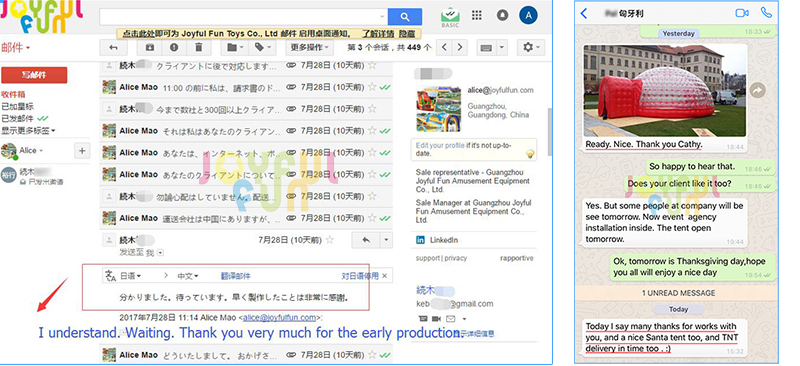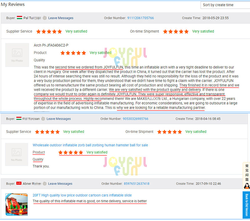 Experience so many years’ production, Joyful Fun factory already had good production system and efficiency that keeps timely shipment. Joyful Fun certainly know how important the timely shipment is. And Joyful Fun factory has the power to make it. Even we complete the order ahead of the date. Our old customers know this. Joyful Fun teams try the best to work for customers could get inflatable product as early as possible.