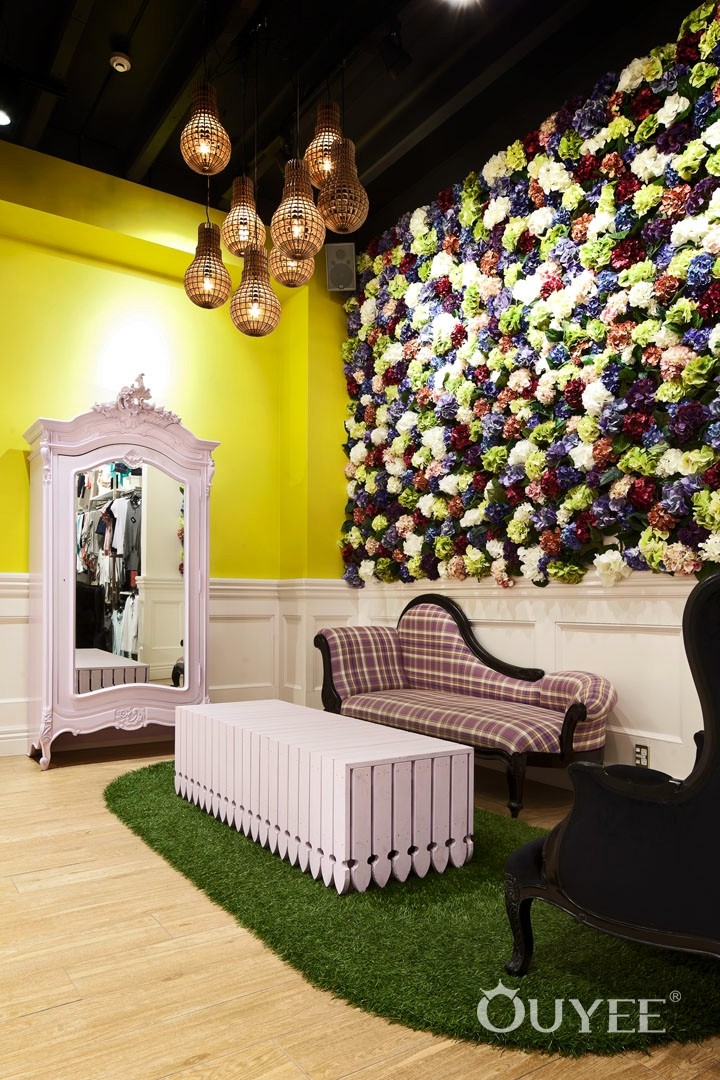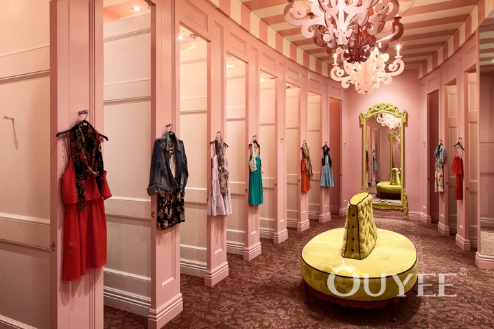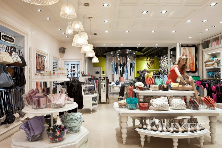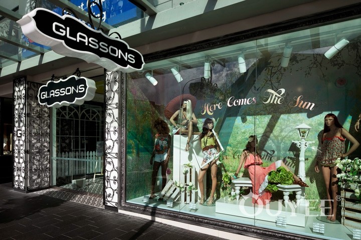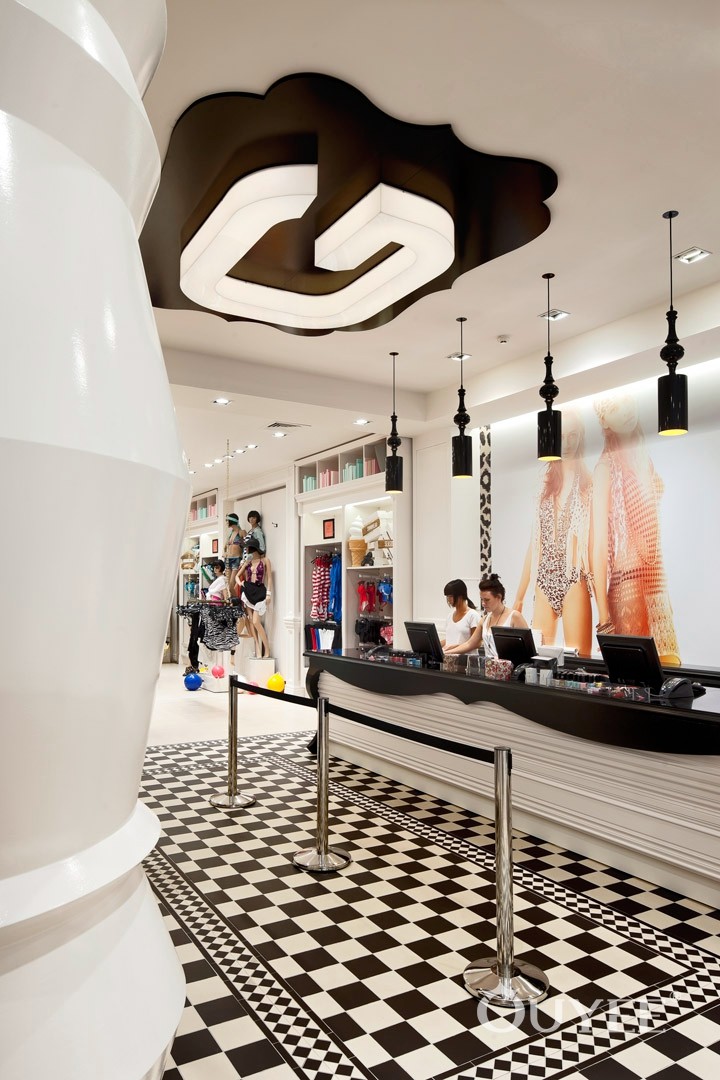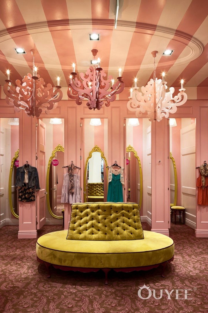 The front window is literally ‘framed’ with an ornate but hardwearing picture frame. The entry portico features wrought iron gates, decorative ceramic floor tiles and a ceiling dome which gives the entry a sense of grandeur. The counter features cabriole legs and decorative timber mouldings like an ornate sideboard. The ‘library’ uses a grand bookcase to display clothes while accessories are showcased in a ‘gallery’ of elegantly framed niches.