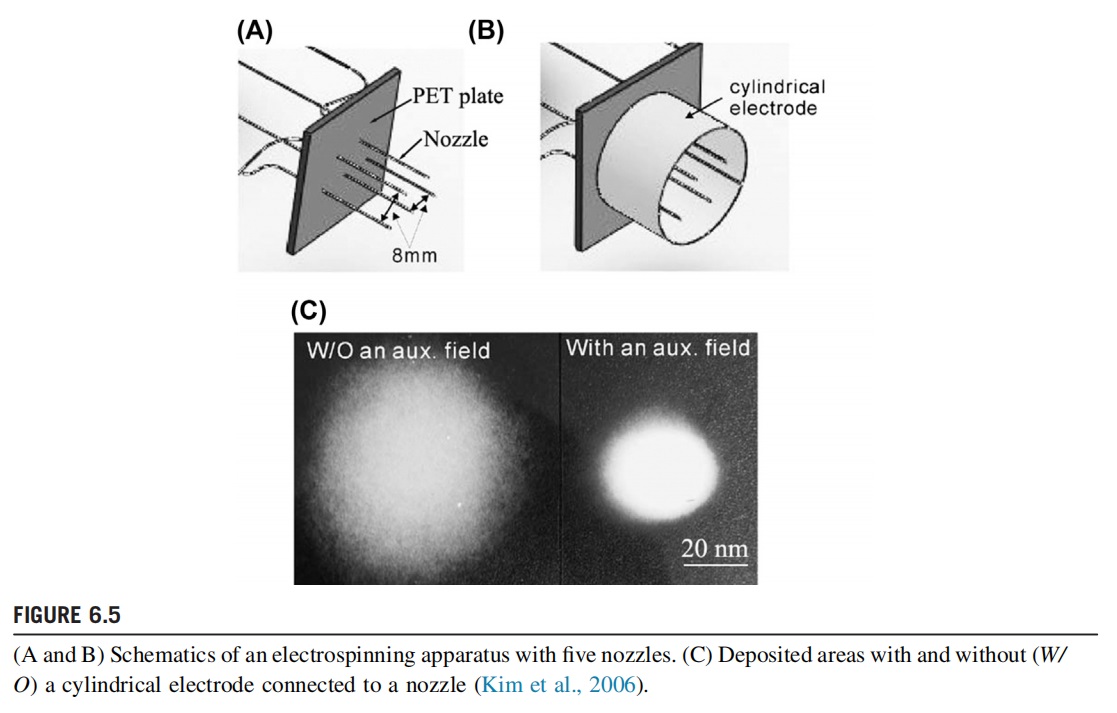 Kim et al. designed a five-needle electrospinning device with an auxiliary electrode (Fig. 6.5) and compared its spinning process to a five-needle electrospinning process without an auxiliary electrode. It was found that the initial jet and the entire electrospinning process were more stable when an auxiliary electrode was added. The mutual electric field interference between the jets was obviously reduced and the diameter and yield of the nanofibers both increased. In addition, Kim et al. also studied an electrospinning process that utilized different numbers of needles with auxiliary electrodes and found that the nanofiber deposition weight of each needle was similar to that of singleneedle electrospinning under the same spinning conditions. Therefore, the nanofiber yield increases linearly with the increase in the number of needles when an auxiliary electrode is added to the electrospinning system.