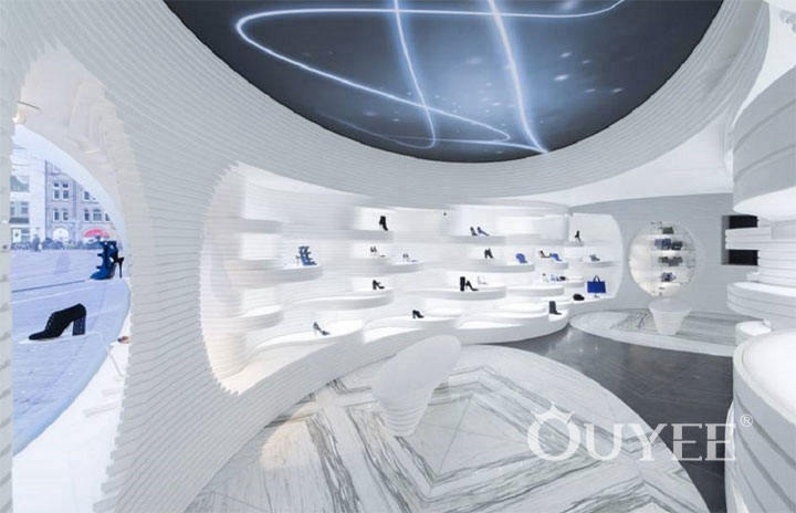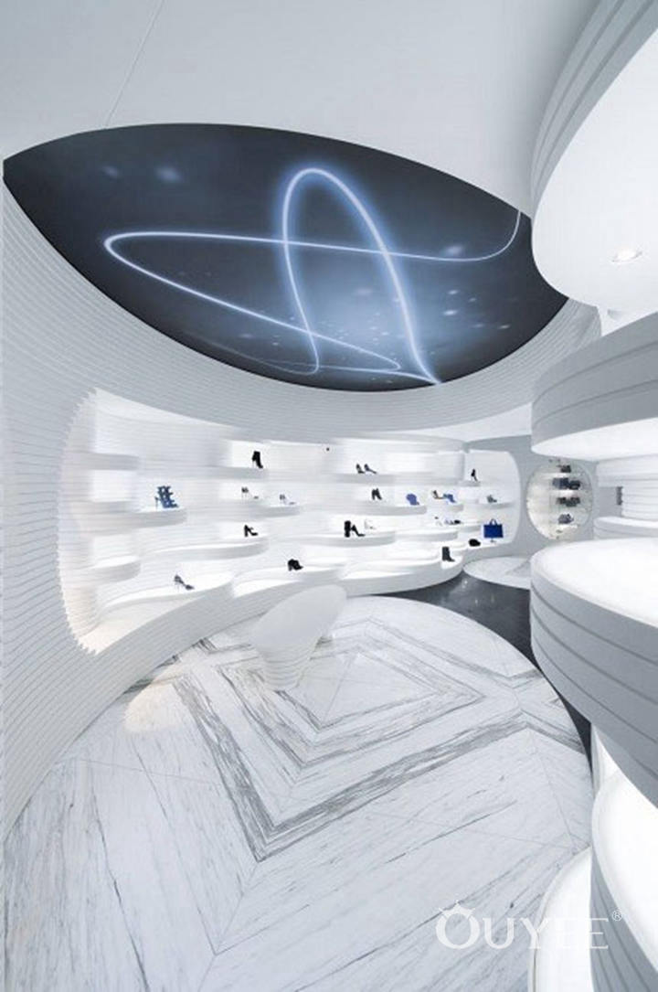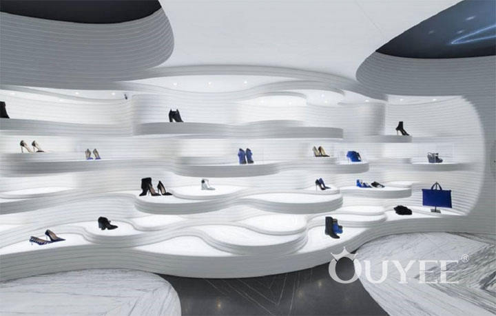 The interior is designed using acrylic stone, a thermoformable material that allows for the construction of an atypical display, with seamless joints and a sleek look. The conventional rectangular shelves are replaced by wavy ones, of different sizes, heights and shapes, combined in such a way that the contours of the display ensemble are never uniform, nor predictable.