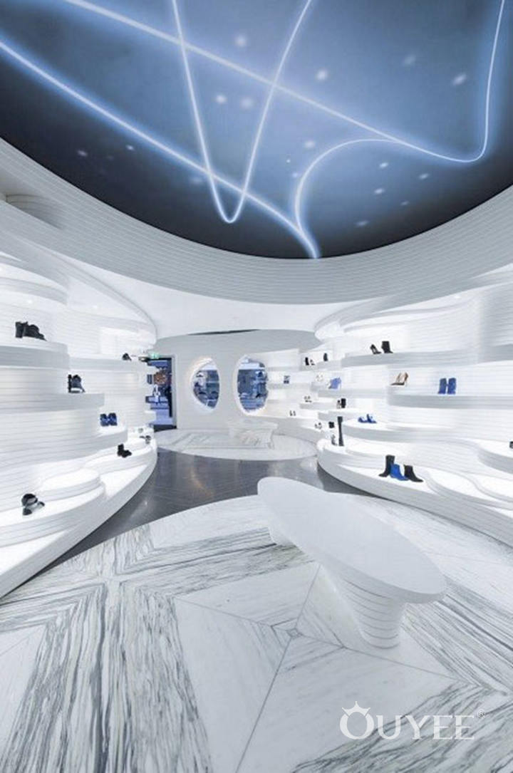 Striving for a cohesive design, the curves continue into the ceiling, the floor patterns and even the custom-designed seating. The simple chromatic scheme is dominated by white, which, combined with the localized integrated lighting, puts the emphasis on the shoes.