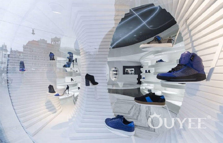 In the typical store, shoes are usually treated and displayed as simple products, without any special thought to how their shape or color interact with the interior design of the space. It is as if these functional pieces only ask for functional spaces, so the customers end up seeing shoes as simple objects that will soon hit the pavement.