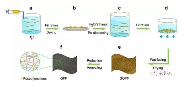 (f) Black graphene nonwoven fabric was obtained by high temperature or chemical reduction from disordered graphene fibers.