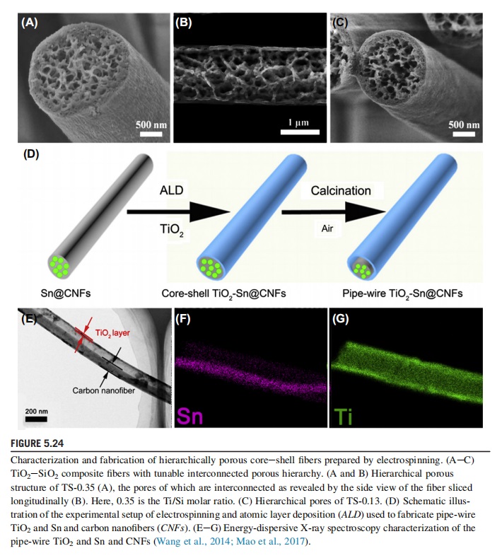 In addition to ME-ES, other methods can prepare multiporous fibers and demonstrate more advantages. For example, Yong Zhao’s group for the first time prepared a porous hierarchy of TiO2 and SiO2 heterostructured fibers by electrospinning based on the hydrolysis and polycondensation of inorganic alkoxides. The fabrication of porous TiO2-SiO2 fibers is accomplished by singlespinneret electrospinning without using sacrificial templates and special heat treatment. TiO2 and SiO2 composite fibers with narrow mesopores, meso/macropores, and micro/meso/macropores have been obtained, and the factors governing the porous hierarchy have been investigated. Fig. 5.24AeC are TiO2-SiO2 composite fibers with a tunable interconnected porous hierarchy. Mesoporous TiO2-SiO2 fibers exhibit excellent photocatalytic activity in the degradation of rhodamine B, comparable to Degussa P25. The photocatalytic activities of the TiO2-SiO2 fibers may be attributed to the combined merits of mesoporosity, high specific surface area, good adsorption capacity for rhodamine B, and anataseerutile heterojunction. Wang et al. reveals the potential applications for using of hydrolysis and polycondensation of inorganic alkoxides in the preparation of heterostructured inorganic fibers of desired porous structure.