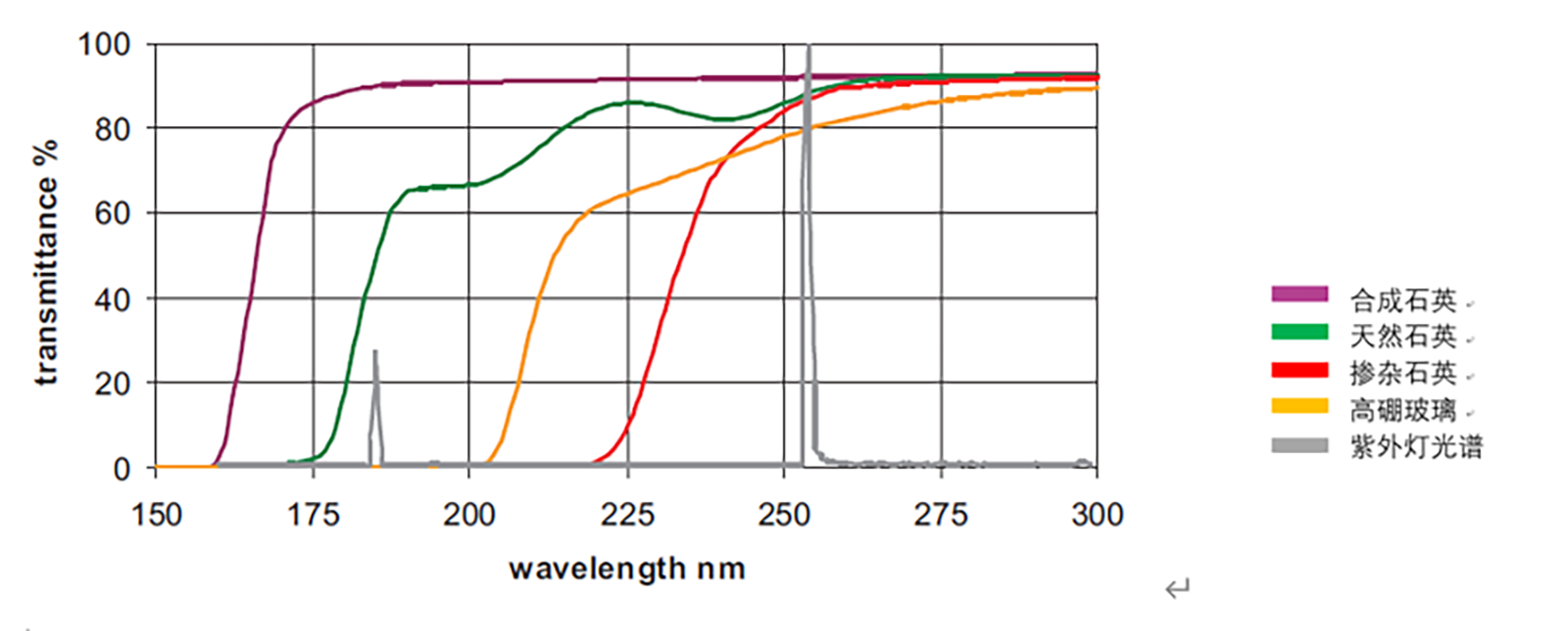 There are three main factors that affect the irradiation intensity of the ultraviolet lamp, which are the total power of the ultraviolet lamp, the lamp tube material and the supporting power supply. Here it is emphasized that the ultraviolet transmittance of the quartz glass material is higher than 85%, which is superior to the high boron glass material It is more helpful to increase the irradiation intensity of the ultraviolet lamp, as shown in the following figure: